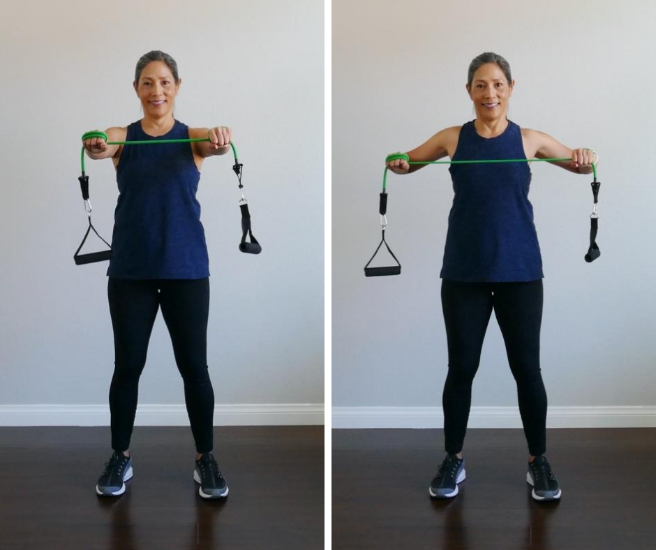 Hold band at chest level shoulder width apart with no tension